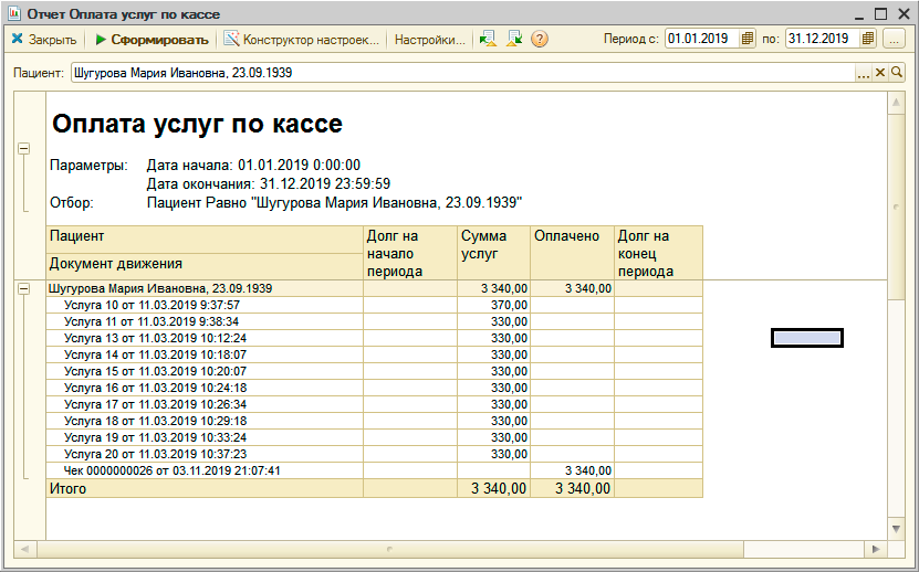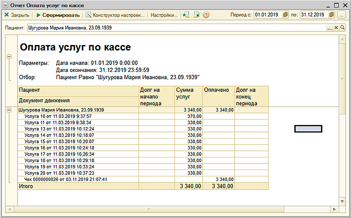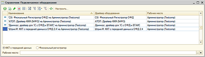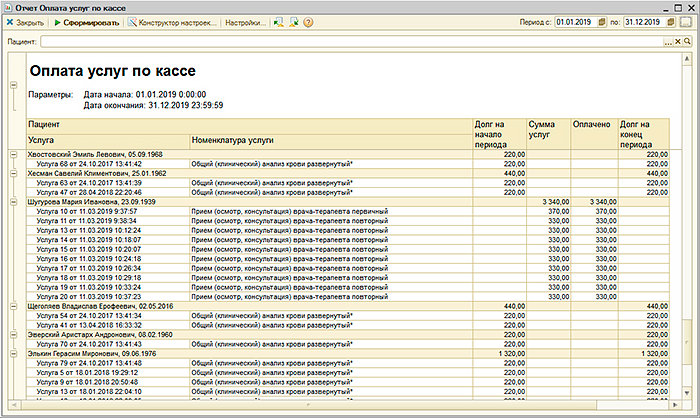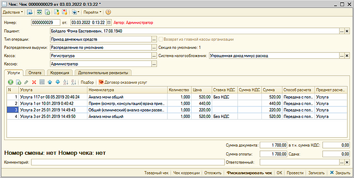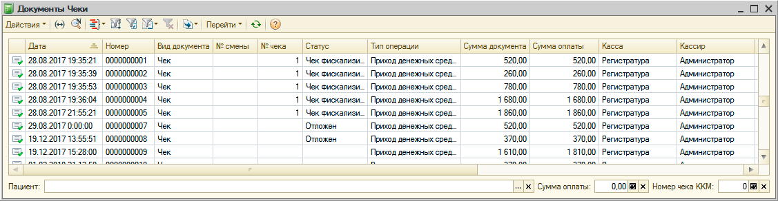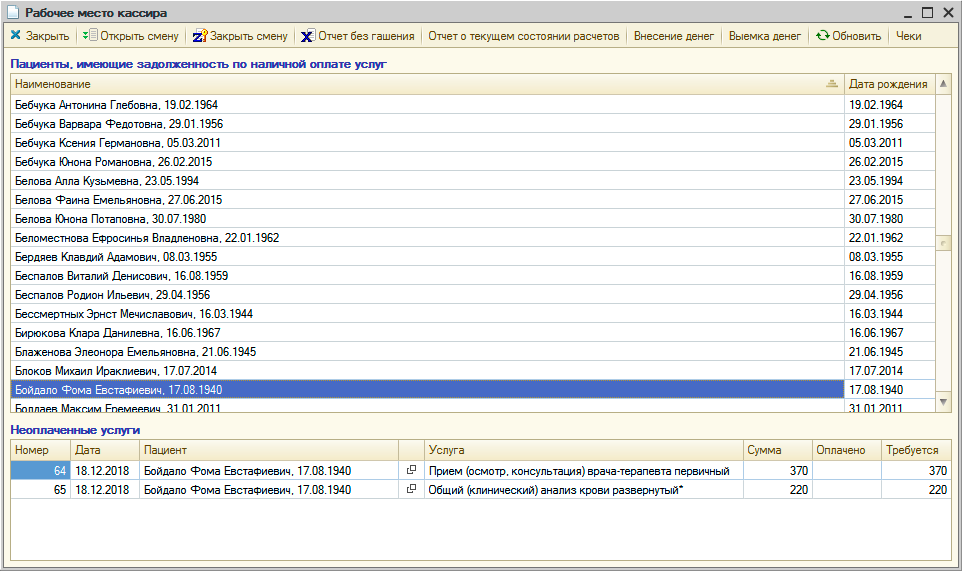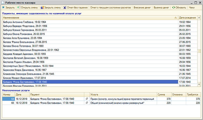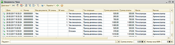 ИСПОЛЬЗОВАНИЕ КОНТРОЛЬНО-КАССОВОЙ ТЕХНИКИВ "Рутине" реализована возможность регистрации наличной и безналичной оплаты медицинских услуг с использованием распространенных моделей контрольно-кассовой техники. Для хранения информации о контрольно-кассовой технике используется справочник "Подключаемое оборудование". в котором производится параметрическая настройка каждого из экземпляров ККТ. С использованием подключенной ККТ в "Рутине" регистрируется оплата услуг. Для кассира имеется специальное "рабочее место", где отображается задолженность пациентов по оплате услуг, а также инструменты для регистрации оплаты и работе с ККТ. Наличная оплата услуг регистрируется документом "Чек". Также имеется журнал документов "Чек". В отчете "Оплата услуг по кассе" отображается состояние расчетов по наличной оплате услуг как в целом так и по отдельному пациенту |