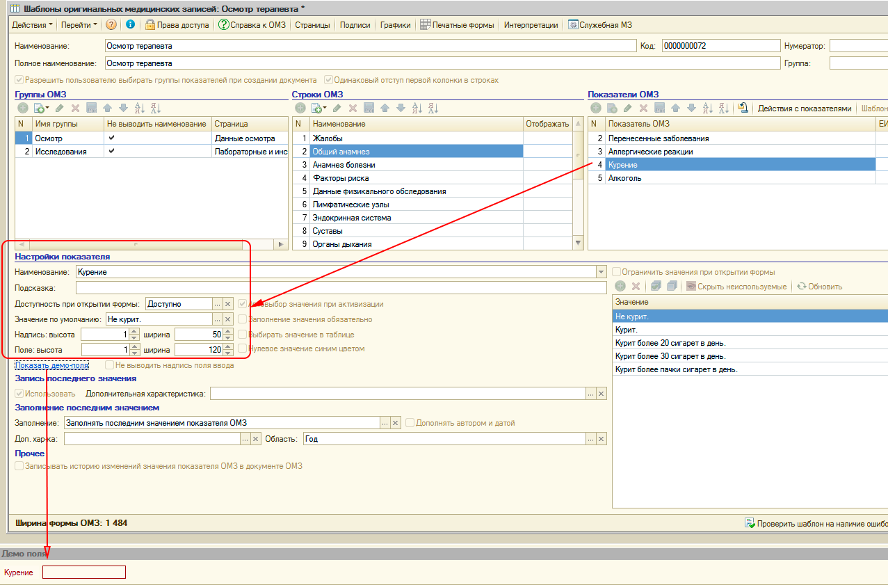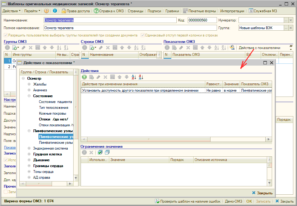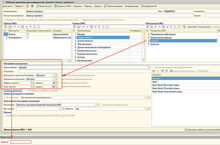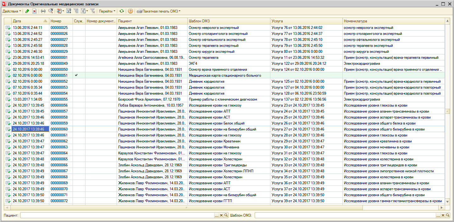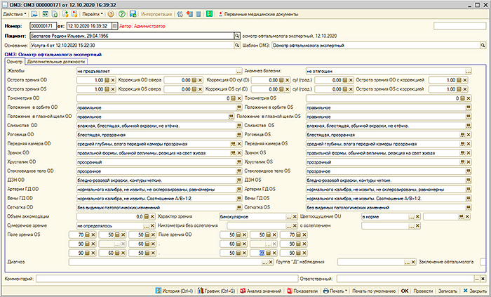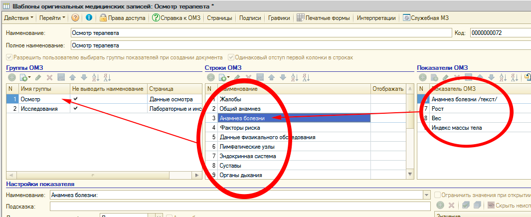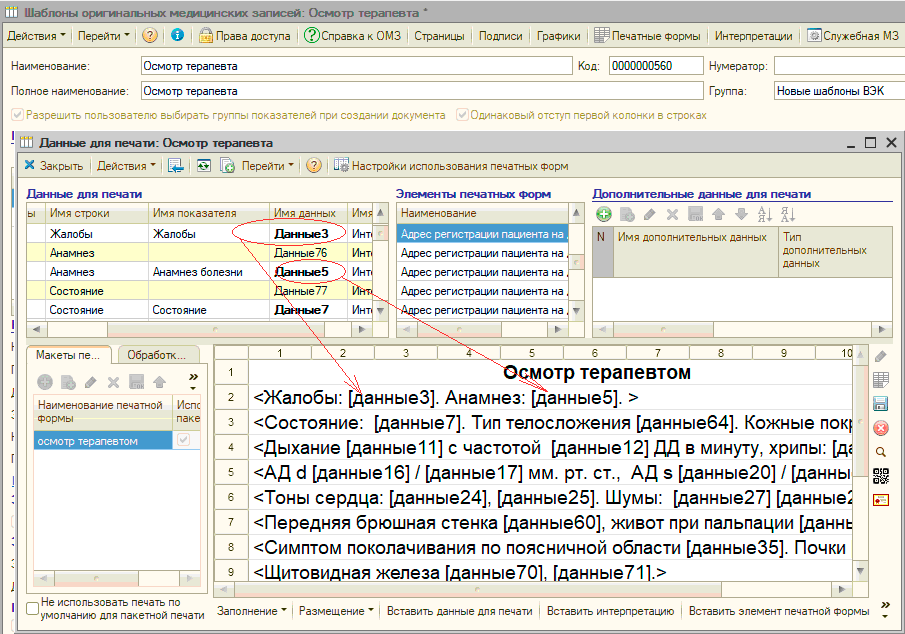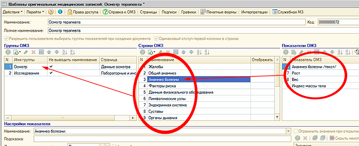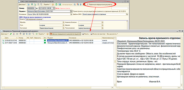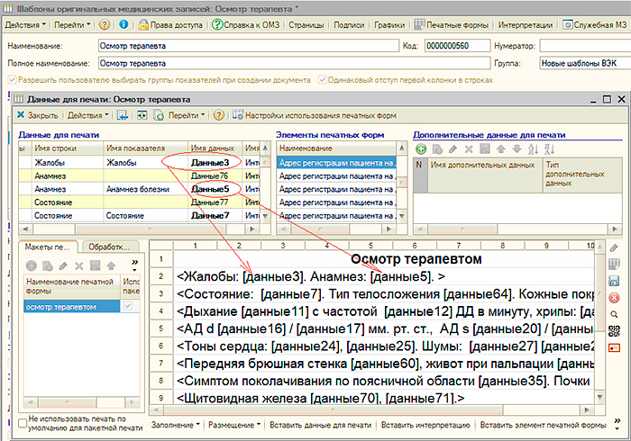 Все эти данные регистрируются в "Рутине" документом «Оригинальная медицинская запись» (ОМЗ). Содержанием документа "Оригинальная медицинская запись" являются соответствия показателей оригинальных медицинских записей и их значений, введенных пользователем. Под показателями ОМЗ понимается описание минимального неделимого объема данных, получаемых во время оказания медицинской услуги. Например, показатель «Частота пульса» может быть включен в ОМЗ, создаваемую терапевтом, хирургом, гинекологом или любым другим специалистом. В дальнейшем можно просматривать и анализировать значения этого показателя вне зависимости от того в какой из оригинальных медицинских записей значение было зарегистрировано. В документе "Оригинальная медицинская запись" регистрируются данные, полученных во время оказания медицинской услуги, соответственно документ связан с документом «Услуга». Для документов "Оригинальная медицинская запись" в "Рутине" имеется соответствующий журнал Состав и структура, порядок ввода информации, получаемой при оказании медицинской услуги для каждого документа "Оригинальная медицинская запись" определяется заранее разработанным шаблоном оригинальной медицинской записи. В рамках шаблона оригинальной медицинской записи «Показатели ОМЗ» группируются в «Строки ОМЗ», которые в свою очередь группируются в «Группы ОМЗ» Для того, чтобы пользователь в документе "Оригинальная медицинская запись" мог быстро и эффективно вводить информацию в шаблоне ОМЗ, для каждого показателя предусматриваются различные настройки - представление показателя, значение по умолчанию, размеры и формат поля ввода и многие другие. Значения показателей ОМЗ могут вводиться пользователем произвольно или выбираться из заранее предопределенного списка значений. Также в "Рутине" имеются механизмы для заполнения значений показателей ОМЗ в документе "Оригинальная медицинская запись последними для пациента значениями. Настраиваются эти механизмы также в шаблонах оригинальных медицинских записей. При заполнении показателей ОМЗ возможно их автоматическое заполнение исходя из значений других показателей ОМЗ. В шаблонах ОМЗ также описывается логика поведения документов "Оригинальная медицинская запись" при работе пользователя с данными документа. Например при вводе определенного значения показателя ОМЗ программа автоматически сделает доступным для ввода значения поле другого показателя или перейдет к полю ввода другого показателя или, например, рассчитать значение определенного показателя. Имеющиеся в "Рутине" инструменты позволяют создавать весьма сложную логику работы с документом "Оригинальная медицинская запись". Данные, содержащиеся в документе «Оригинальная медицинская запись» используются для формирования документов «Первичный медицинский документ», который является текстово-графическим представлением данных медицинской записи. Для этого в шаблоне оригинальной медицинской записи разрабатываются печатные формы. Для разработки печатных форм в "Рутине" имеется визуальный конструктор, в котором пользователь по своему усмотрению формирует данные для построения первичного медицинского документа. Для разработки шаблона оригинальной медицинской записи не требуется специальных знаний, создание шаблонов производитс