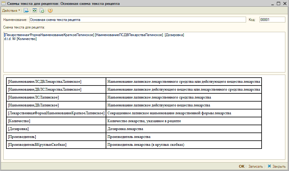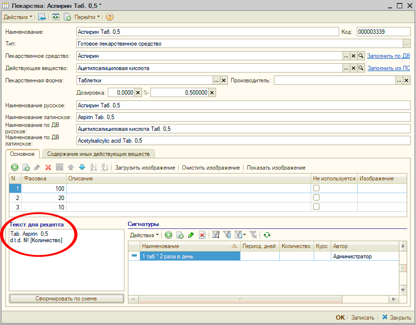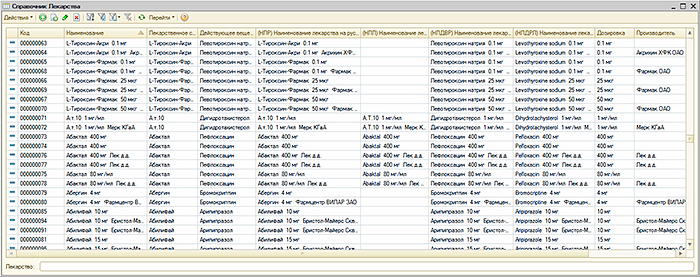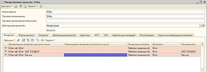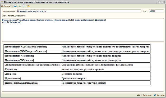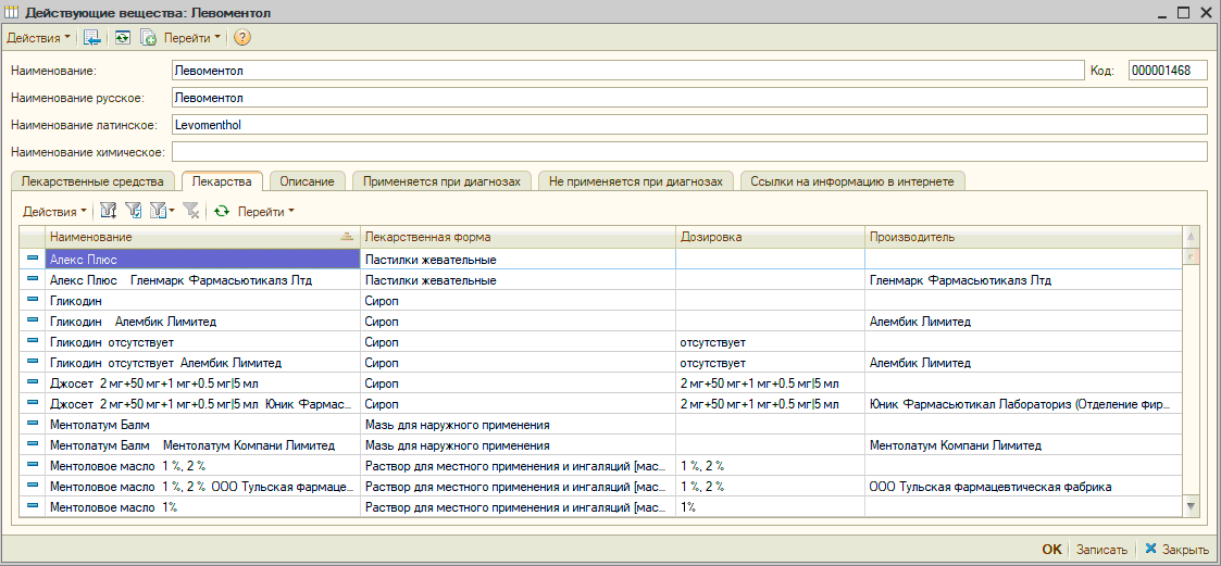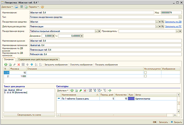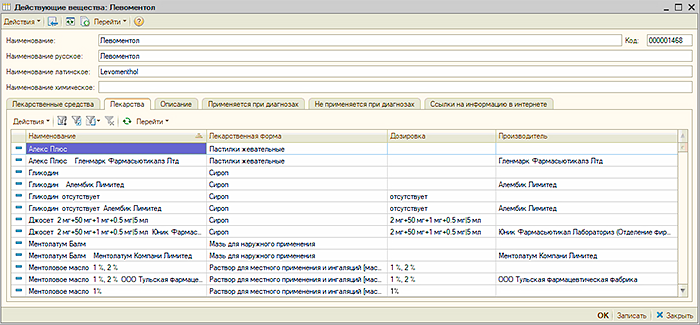 УЧЕТ ЛЕКАРСТВЕННЫХ СРЕДСТВПод лекарством в МИС понимается производимый производителем продукт в виде таблетки, ампулы, флакона и так далее, имеющий или не имеющий первичную упаковку или имеющий такую первичную упаковку, которая является общей для некоторого количества лекарств и позволяет разделить это количество лекарств на части не нарушая их целостности и свойств. В "Рутине" лекарства учитываются в одноименном справочнике. В форме элемента справочника «Лекарства» содержатся сведения о лекарстве, включая информацию о действующих веществах, наименованиях лекарства на русским и латинском языках, наименованиях по действующему веществу и другая информация по которой возможен поиск лекарства при создании документа "Рецепт". Также для лекарства указываются «дозировка», «производитель», «лекарственное средство», «лекарственная форма» а также варианты фасовки лекарства производителем, текст и сигнатуры для рецепта. Кроме этого могут быть загружены изображения фасовок лекарства. В "Рутине" имеются справочники «Лекарственные средства» и «Действующие вещества». Справочник «Действующие вещества» содержит информацию о действующих веществах лекарств. Для выбора в документ "Рецепт" лекарства по действующему веществу в списке поиска присутствуют действующие вещества лекарств. В случае, если пользователь выбрал действующее вещество будет представлен для выбора список лекарств, содержащих указанное действующее вещество. Для выбора в документ "Рецепт" лекарства по лекарственному средству пользователь может использовать справочник «Лекарственные средства», в котором лекарственному средству сопоставлены лекарства. В "Рутине" предусмотрено создание схемы прописи рецептов с помощью которой в элементе справочника "Лекарства" при нажатии кнопки «Сформировать по схеме» автоматически формируется текст прописи для лекарства. Это позволяет формировать впоследствии пропись рецепта автоматически. |