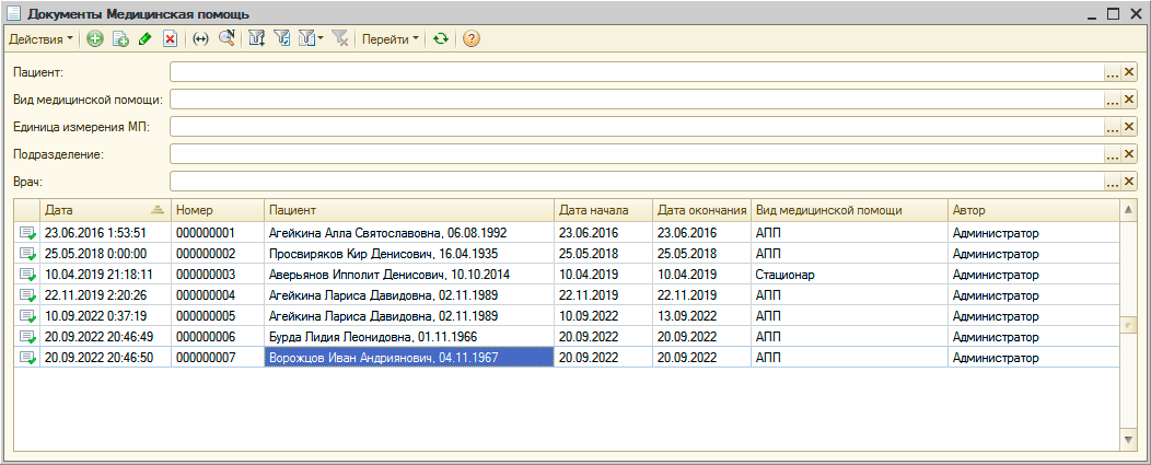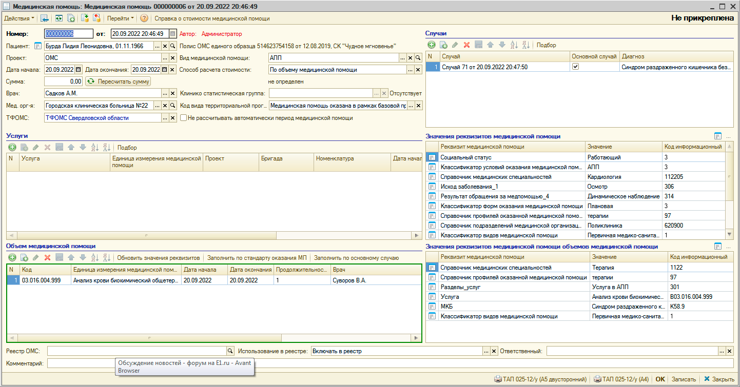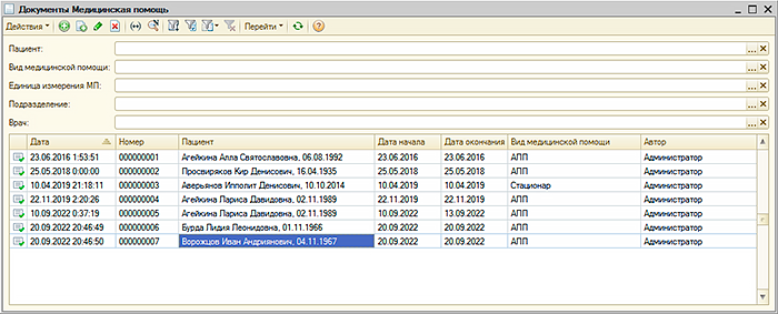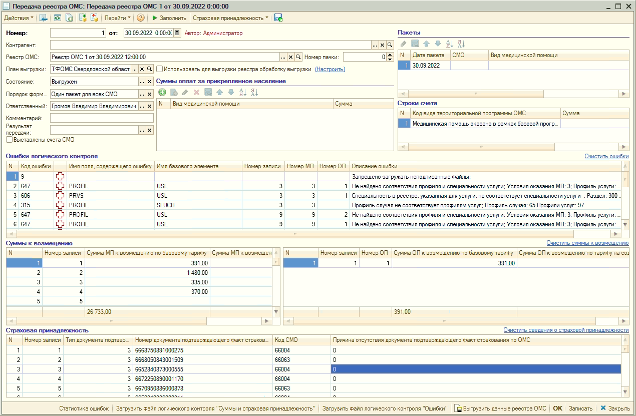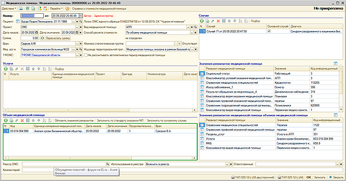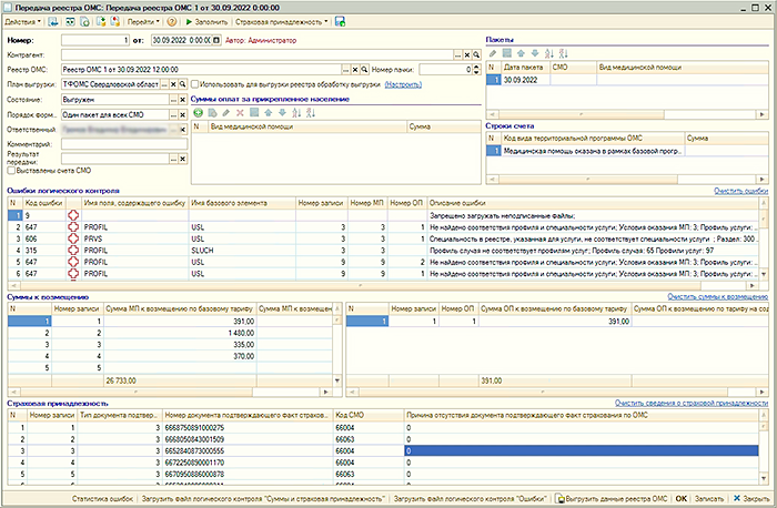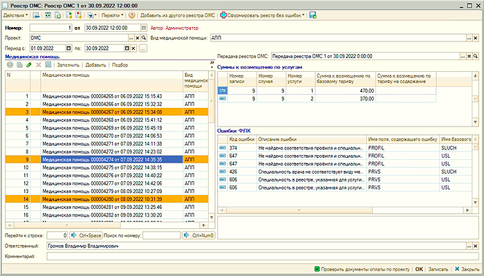 УЧЕТ МЕДИЦИНСКОЙ ПОМОЩИВ "Рутине" ведется регистрация и учет оказанной медицинской помощи. Имеется журнал документов "Медицинская помощь". В документе "Медицинская помощь" учитываются объемы медицинской помощи случаи а также данные, необходимые для передачи сведений в территориальный фонд обязательного медицинского страхования. Документы "Медицинская помощь" объединяются документом "Реестр ОМС" для передачи реестра в ТФОМС. Передача информации о реестре в ТФОМС выполняются документом "Передача реестра ОМС", с помощью которого также обрабатывается информация об ошибках и страховых суммах, поступающая от ТФОМС. |