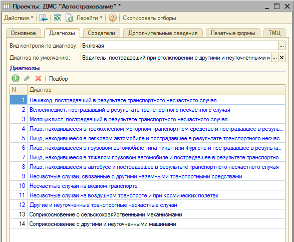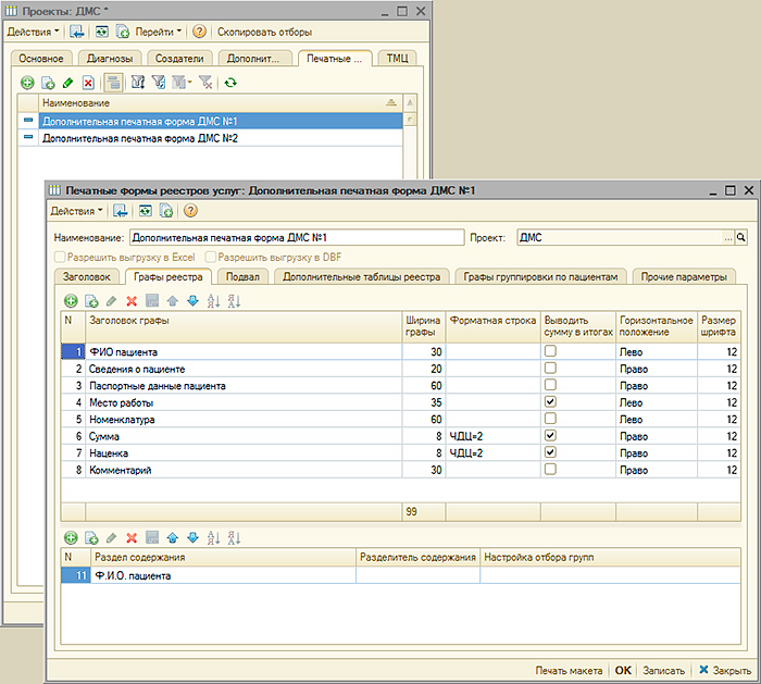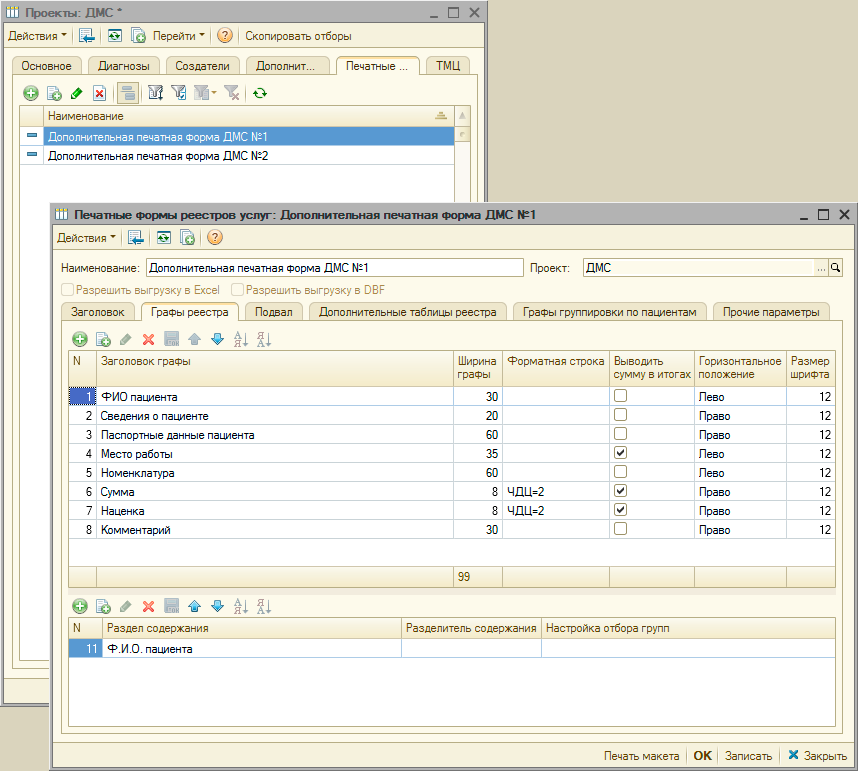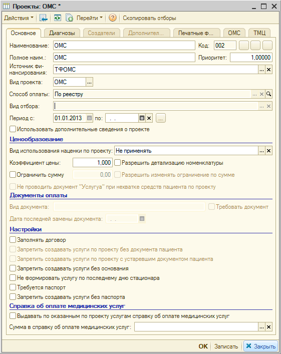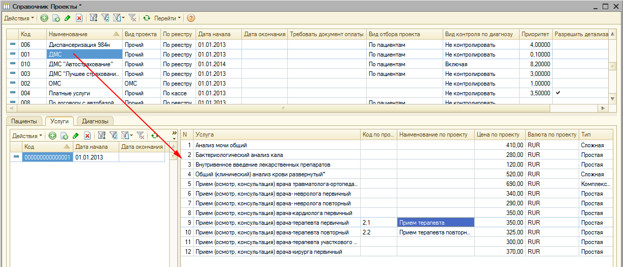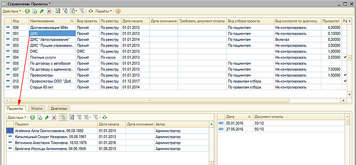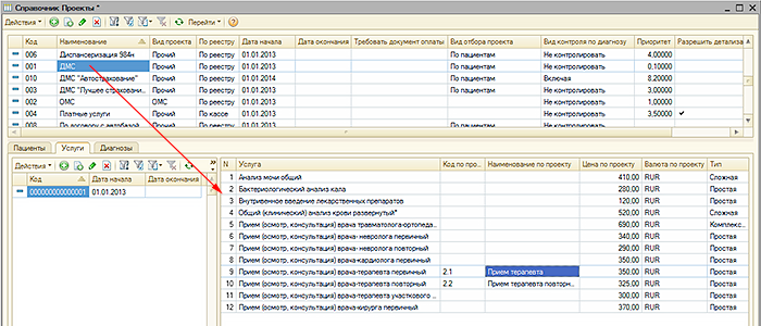 компаниями. В проектах учитываются период действия, специфика ценообразования, способ оплаты услуг, оказанных по проекту. В проекте может быть установлено ограничение для диагнозов пациента, при которых возможно оказание услуг для проекта. Для проекта возможно создать печатные формы реестров услуг, оказанных по проекту, для подачи реестров в страховые компании. Для проекта можно установить список пациентов, которые имеют право получать медицинские услуги в соответствии условиями, описываемыми проектом. Для каждого из пациентов могут быть указаны "документы оплаты", подтверждающие право пациента получать услуги по определенному проекту. Для проекта определяется перечень номенклатуры услуг, которые могут быть оказаны по проекту, определяется цена номенклатуры услуг, наименования и кодировка номенклатуры услуг. |