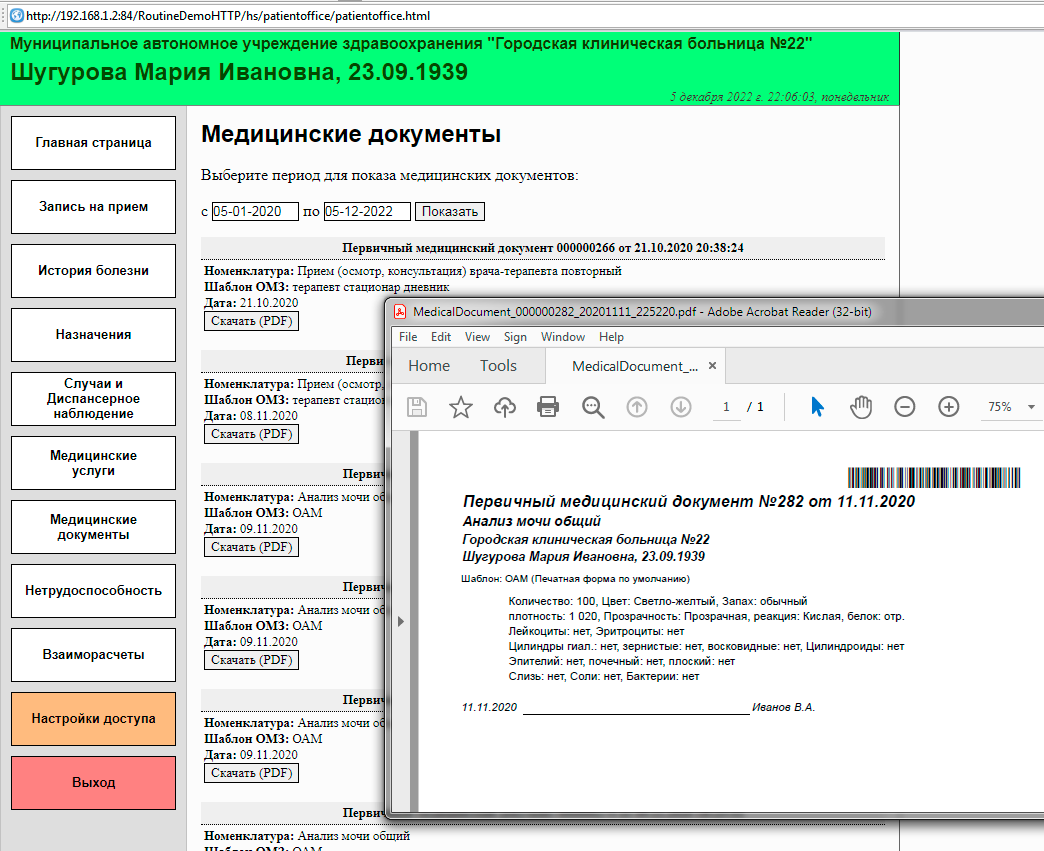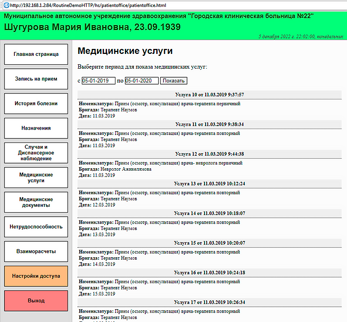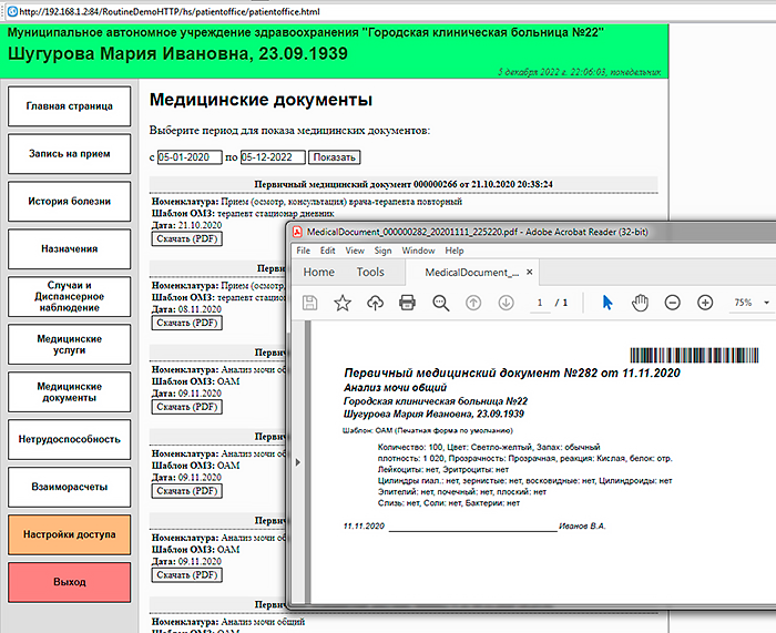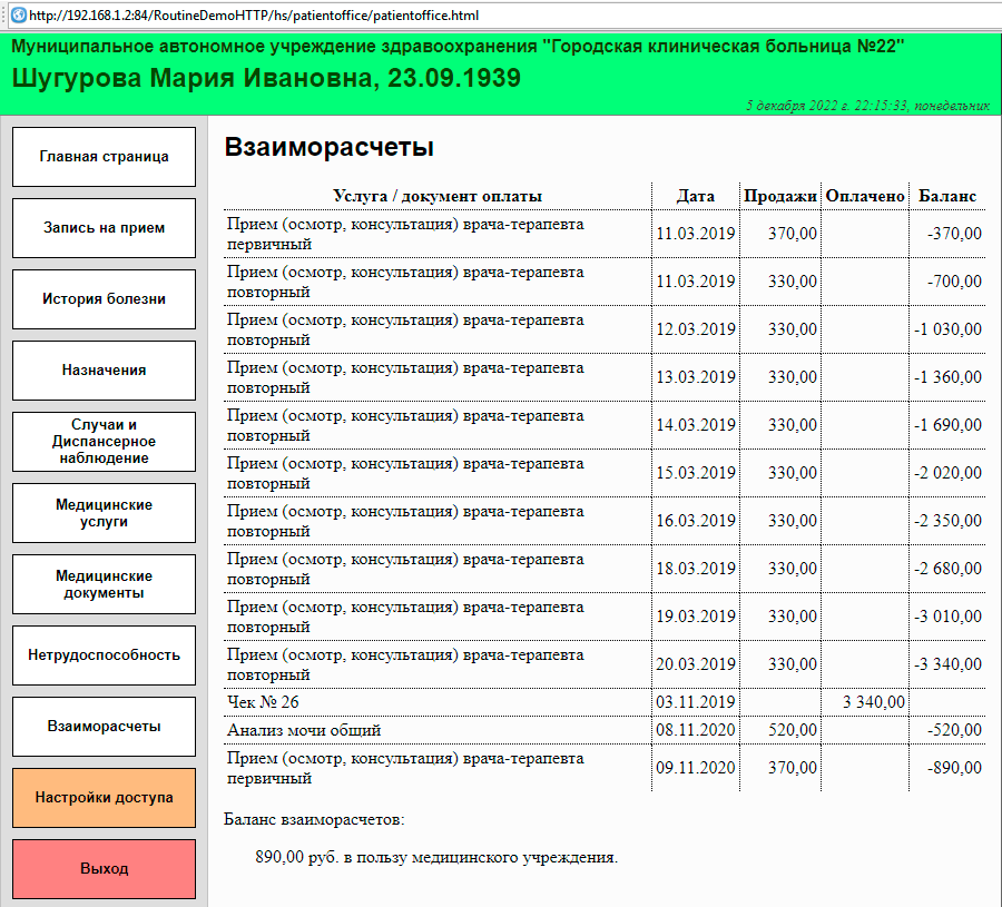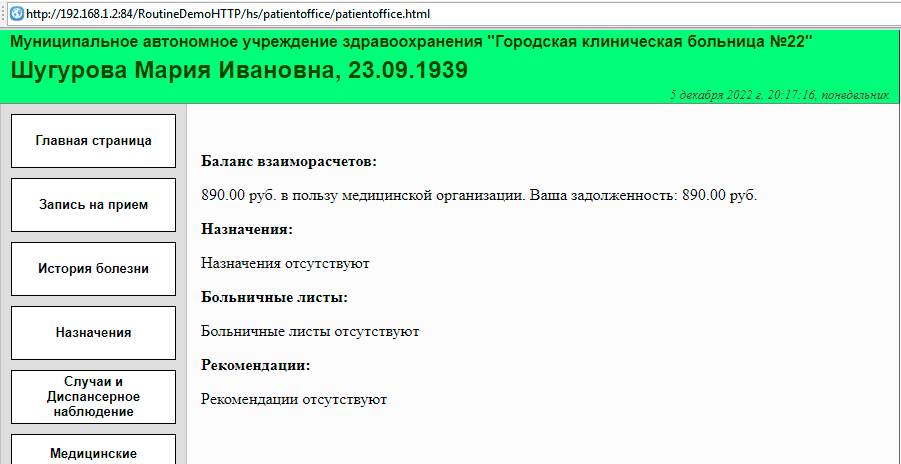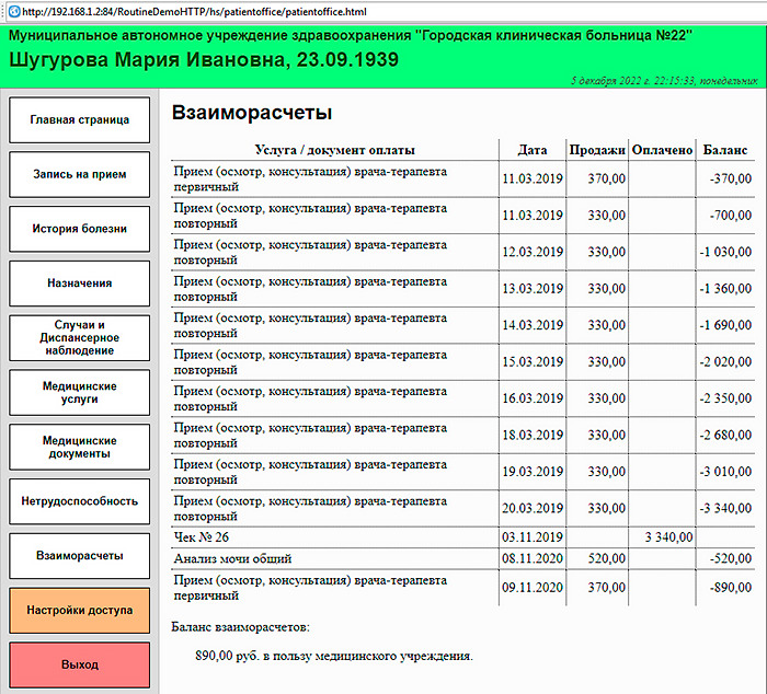 ЛИЧНЫЙ КАБИНЕТ ПАЦИЕНТАВ "Рутине" для удаленного взаимодействия между медицинской организацией и пациентами имеется возможность использования механизма "Личный кабинет пациента". Личный кабинет пациента представляет из себя отдельный веб-сайт, который в свою очередь, может быть интегрирован с веб-сайтом медицинской организации. На главной странице личного кабинета пациента пациент получает сводную информацию о себе. В разделе "Запись на прием" пациент может записаться на прием или создать себе назначение медицинской услуги. Выбрав медицинскую услугу пациент может выбрать дату и время для ее оказания и записаться на прием (или оказание услуги). В разделе "История болезни" пациент может просмотреть перечень историй болезни за выбранный период и скачать любую из историй болезни в формате PDF. В разделе "Назначения" пациент видит свои назначения медицинских услуг за выбранный период. В разделе "Медицинские услуги" пациенту предоставляется информация о медицинских услугах, оказанных медицинской организацией, за выбранный период. В разделе "Медицинские документы" пользователь видит перечень своих первичных медицинских документов, каждый из которых может просмотреть или скачать. В разделе "Нетрудоспособность" пациенту предоставляется информация о периодах нетрудоспособности и больничных листах за выбранный период времени. В разделе "Взаиморасчеты" пациенту предоставляется информация о взаиморасчетах между пациентом и медицинской организацией за весь период оказания услуг и поступления от пациента платежей. В разделе "Настройки доступа" пациент может изменить пароль для доступа в личный кабинет пользователя и установить адрес электронной почты для восстановления пароля к личному кабинету пользователя. Верификация личности пациента и первичное предоставление пациенту учетных данных для доступа в личный кабинет пациента производится при личном присутствии пациента под роспись пациента. |