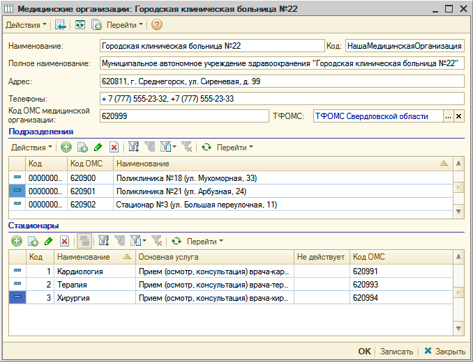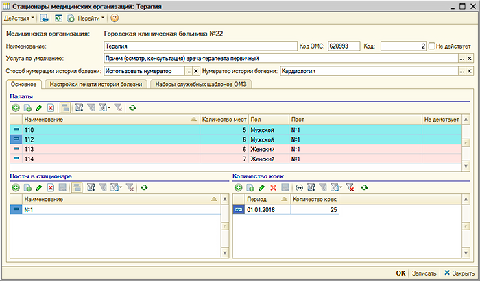 УЧЕТ МЕДИЦИНСКИХ ОРГАНИЗАЦИЙВ "Рутине" ведется учет медицинских организаций, собственной медицинской организации и сторонних организаций, в справочнике "Медицинские организации". Для организации учитываются основные данные, контактные данные и данные организации в системе ОМС. Учитываются структурные подразделения и стационары в медицинской организации. Для подразделений указываются учетные данные в системе ОМС, а также описывается структура каждого стационара, включая структуру постов в стационаре и палат Так же в "Рутине" учитываются лицензии медицинской организации. |